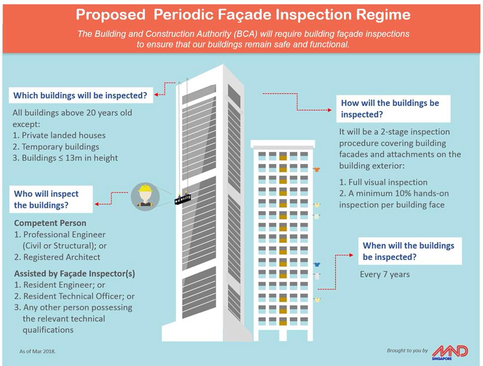 Periodic façade inspection (PFI) regime was introduced to enhance the maintenance requirements of building facades for public safety. It is required by law under the Building Control Act (BCA) for owners to conduct periodic façade inspection PFI for buildings that are more than 20 years of age at every 7 years interval.