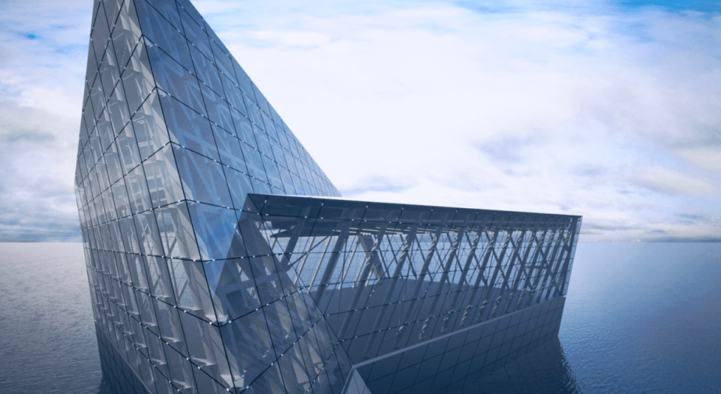 The geometric forms of the gems animate the views from the promenade, reflecting views of the sky city and water during the day, and transforming to glow as dramatically lit beacons by night.