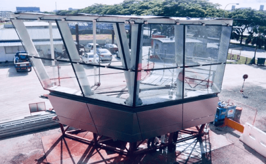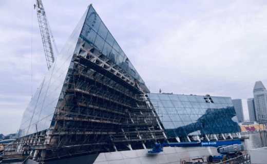 The gem’s planes extend down from glass to stainless steel submerged in water, forming a “skirt” base, capturing Safdie Architect’s “floating” design intent. High-performance specialist fixings were developed by both Façade engineers & AGFD to secure the pavilions’ façade integrity & stability as it absorbs significant impact from changing tide levels in the Marina Bay.